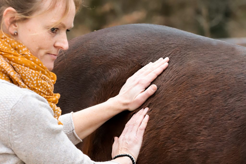 Ich fühle mich mit meinen Händen von der Oberfläche bis in die Tiefe der Strukturen durch das Pferd, auf der Suche nach der Ursache. Um die dort aufgestaute, blockierte Schockenergie aufzuspüren.